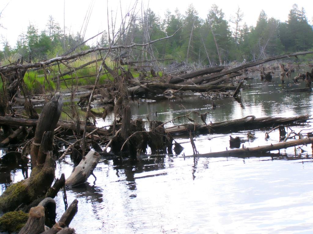 – в основном сосны. По берегам валяется много напиленных чурок. Мы